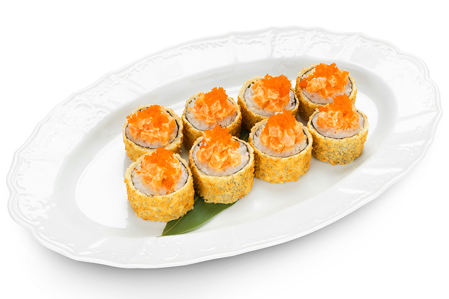 Состав: рис, нори, лосось, крем-сыр, сыр чеддер, икра масаго, огурец, темпура, панко сухари, соус спайс.
