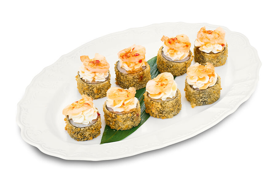 Состав: креветки, крем-сыр Филадельфия, огурец, соус свит чили, рис, нори, панко сухари, темпура кляр.